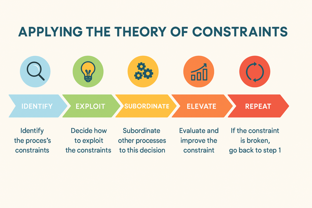 TOC is especially valuable in service operations such as banking, where customer wait times and process delays can significantly impact satisfaction and efficiency. Goldratt outlines a five-step process for applying TOC: